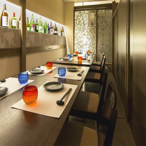 6名様用のテーブル席を1席ご用意。壁際に並ぶ日本酒ボトルが彩る和モダン空間で、ゆったりとした時間をお過ごしください。会社のご宴会やご家族でのお食事、女子会にも最適。旬の鮮魚や牡蠣を使った料理と、厳選された地酒で贅沢なひとときをどうぞ。